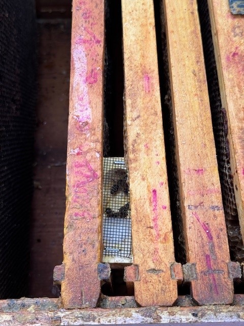 Did you know that there are also small queens? Manny has one that is barely bigger than a worker bee. We found her anyway. Her daughter is the one we marked green in the photo. Green is the color of the year 2024 and by the way, it symbolizes hope. Let’s hold on to it.